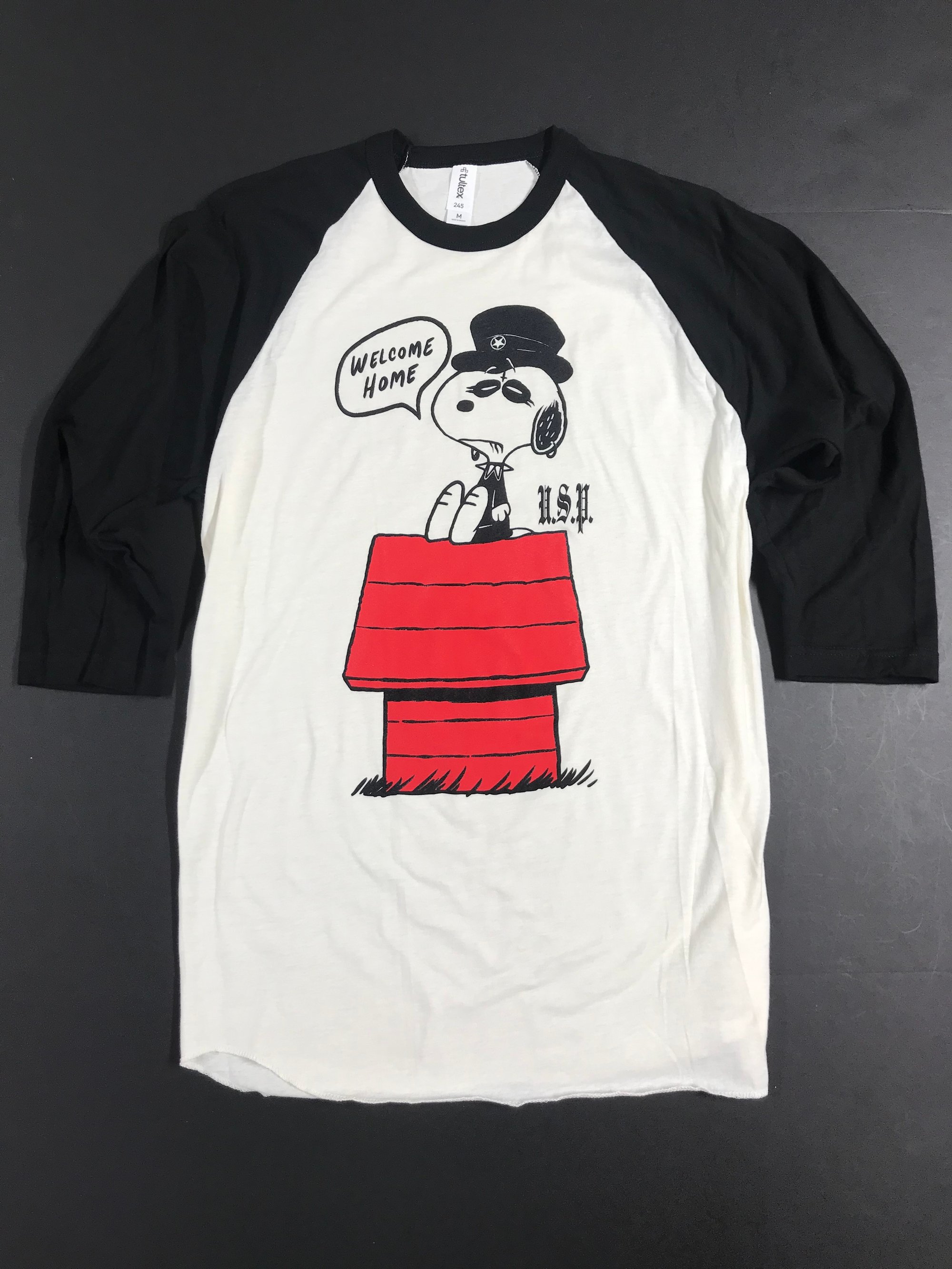 Image screen printed by hand on a UNISEX 100% ring spun soft cotton vintage white and black baseball tee shirt.