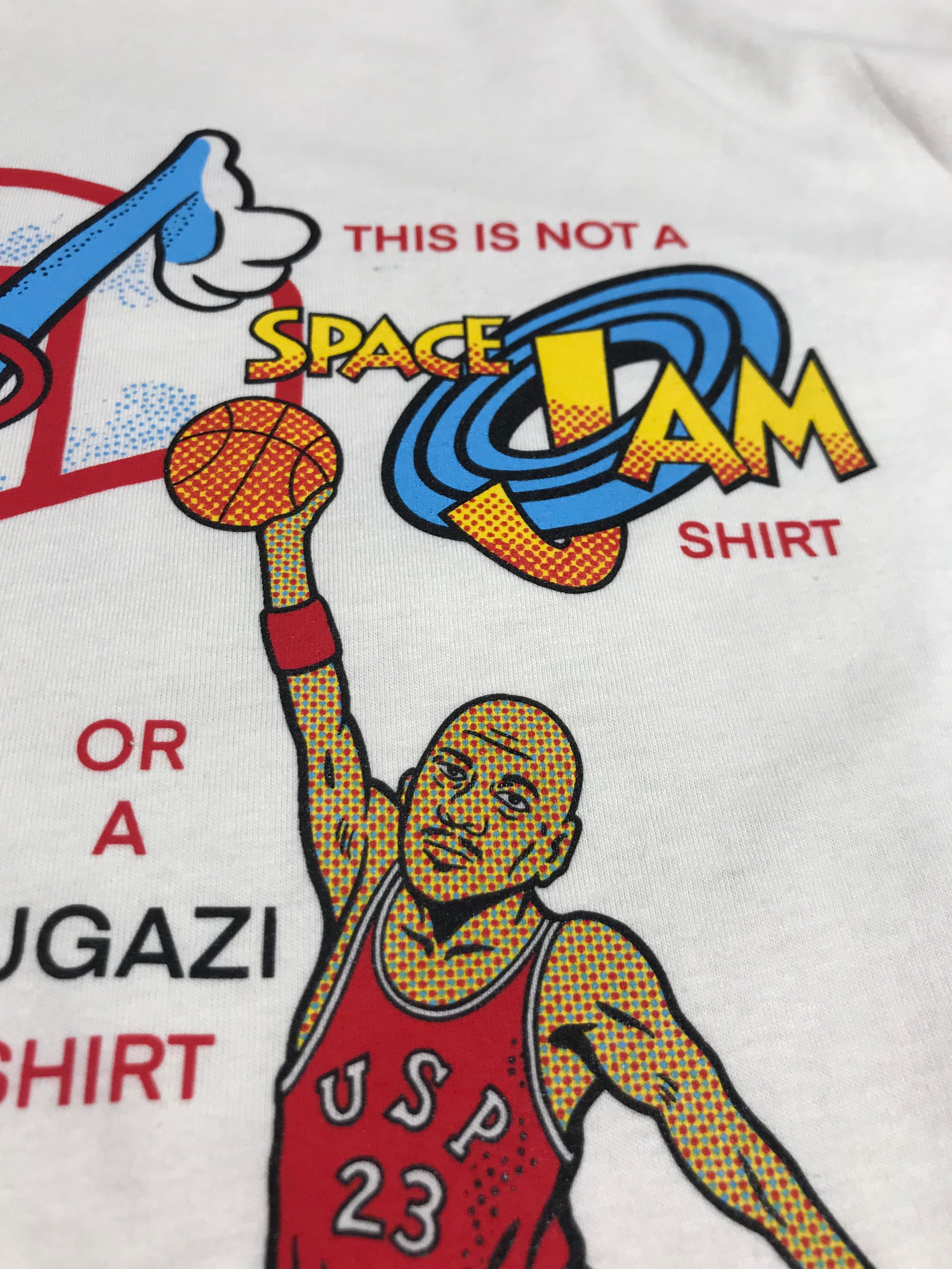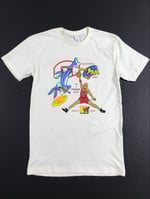Image screen printed by hand on an off-white natural 100% cotton tee.