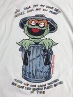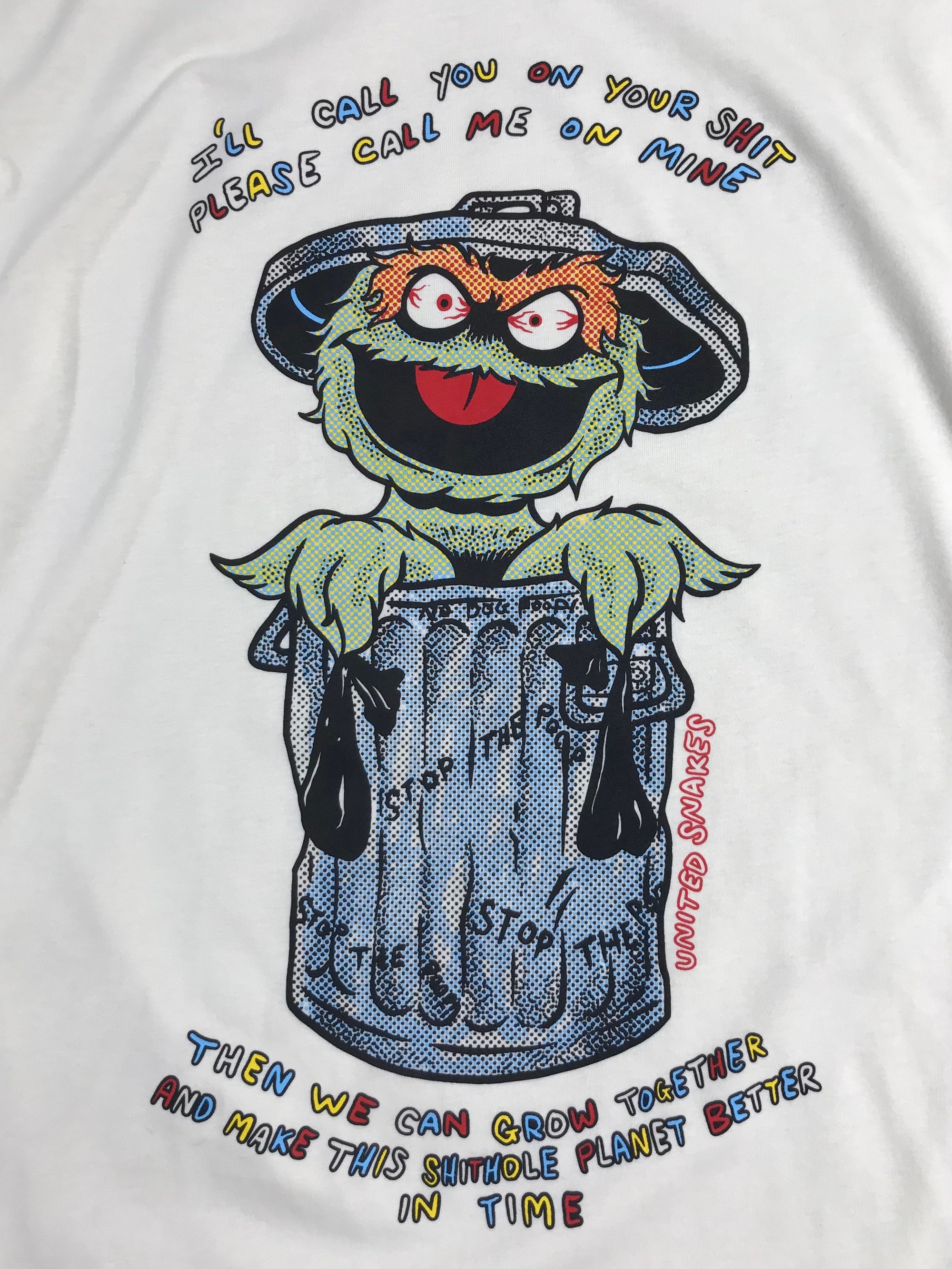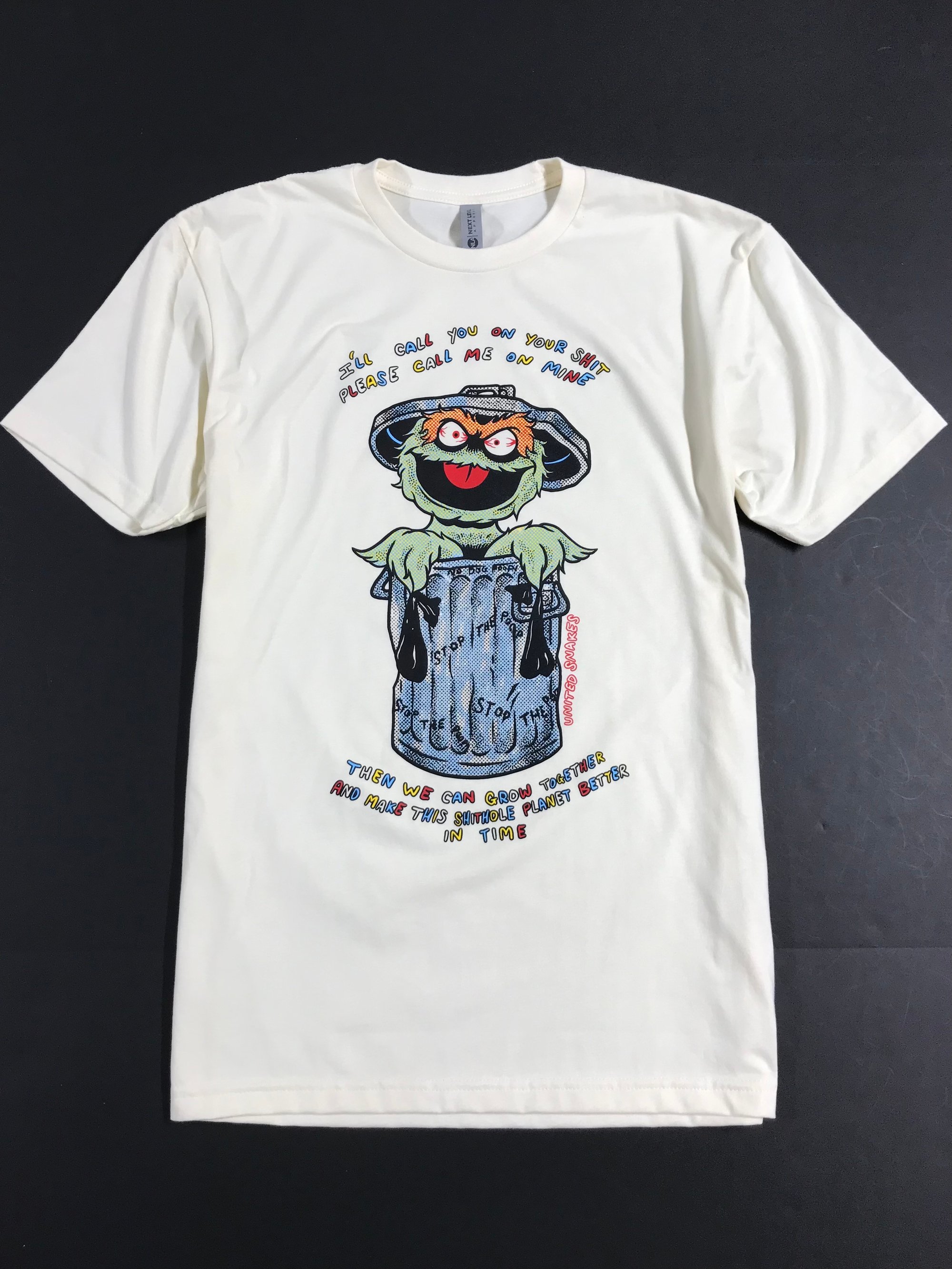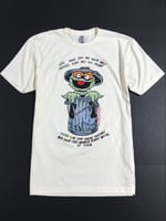 Image screen printed by hand on an off-white natural 100% cotton tee.
