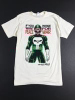 Image screen printed by hand on an off-white natural 100% cotton tee.